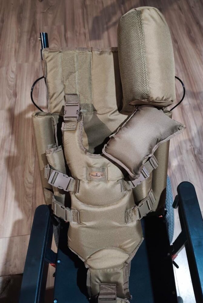 Confeccionado para personas que tienden a posicionamientos que provocan lesiones o interfieren procesos vitales. Corrige postura de tronco y cabeza y mejora procesos de alimentación y respiración al asegurar una posición óptima que por sí solo el usuario no logra. Se compone de un gran respaldo acolchado, tacos removibles posturales laterales y de hombros, además de una cabecera también removible. Se adapta a cama, catre, bipidestador sillas o sillones gracias a un conjunto de sujeciones regulables.